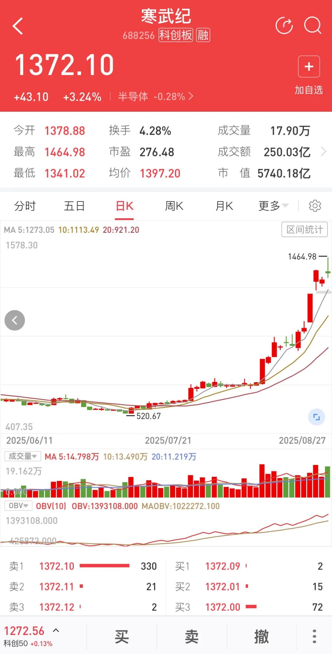 今年以来,寒武纪股价走势强劲,尤其是在7月25日至8月26日期间,累计涨幅高达121.42%。