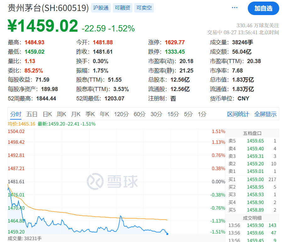 截至13时56分,寒武纪股价报1417.60元/股,上涨6.67%;而贵州茅台股价为1459.02元/股,下跌1.52%。